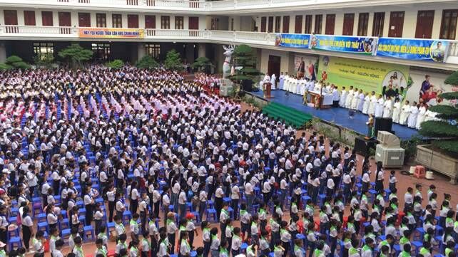 弥撒由儿童铜管乐队开道,主教神父徐徐走向祭台,整台弥撒由儿童唱经班和儿童读经班担任,真是天籁之音。整台弥撒中,孩子们大声地唱经和念出对答,没有一个孩子走动、吃零食、喝水、玩手机。孩子们那份对信仰的执着和虔敬,再一次震撼了我的心灵。对比我们这里的孩子,一样大的年龄,却有着很大的差距,这种差距,让人深思。我又联想到圣经中描写圣神降临节的情形,有三千人领洗的场面在这里重现。越南的教会后继有人啊!孩子们大声回应着主教的号召,我仿佛看到了未来的神父和修女在这些孩子们中间产生。同样是社会主义国家,对比我们中国教会,真是让人难过和痛惜。