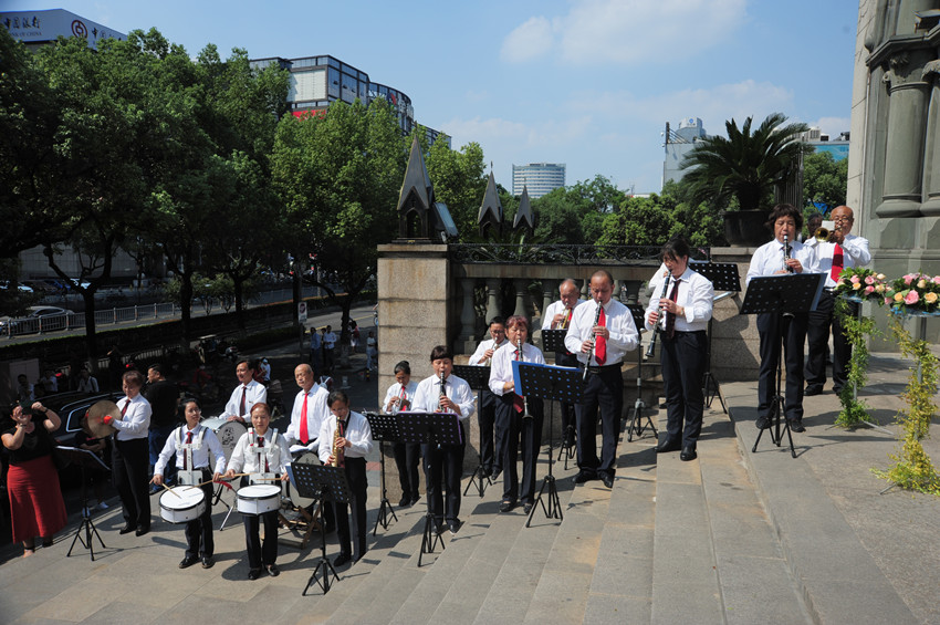 2018年10月3日一早,乐队队员穿戴整齐,在教堂门口开始迎宾,吸引了众多的路人,迎来了参加婚配弥撒的教友和亲朋好友。9时正,随着婚礼进行曲响起,新郎贺士容和新娘马婷婷手挽着手庄重走向圣殿前方指定座位。