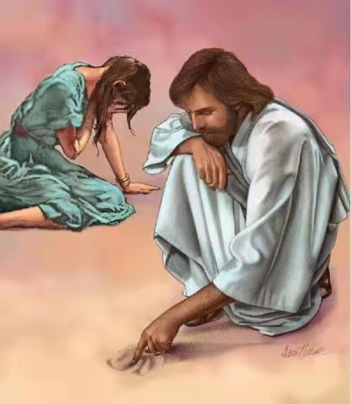 那时候,耶稣上了橄榄山。第二天清晨他又来到圣殿,民众都来到他跟前,他便坐下教导他们。那时,经师和法利塞人带来了一个犯奸淫时被抓到的妇人,让她站在中间,然后对耶稣说:“老师!这妇人是正在犯奸淫时被抓到的,这样的妇人,梅瑟在法律上命令我们用石头打死;可是,你说什么呢?”他们说这话是要试探耶稣,好能找到把柄控告他;耶稣却弯下身子,用指头在地上写字。他们不住地追问耶稣,他便直起身来,对他们说:“你们中间谁没有罪,就先向她投石头吧!”他又弯下身子在地上写字。他们听了这话就从年老的开始到年幼的,一个一个地都溜走了,只留下耶稣,和还站在那里的妇人。耶稣直起身来对她说:“妇人!他们在哪里?没有人定你的罪吗?”她说:“主啊!没有。”耶稣对她说:“我也不定你的罪;去吧!从今以后不要再犯罪了!”(若8:1-11)